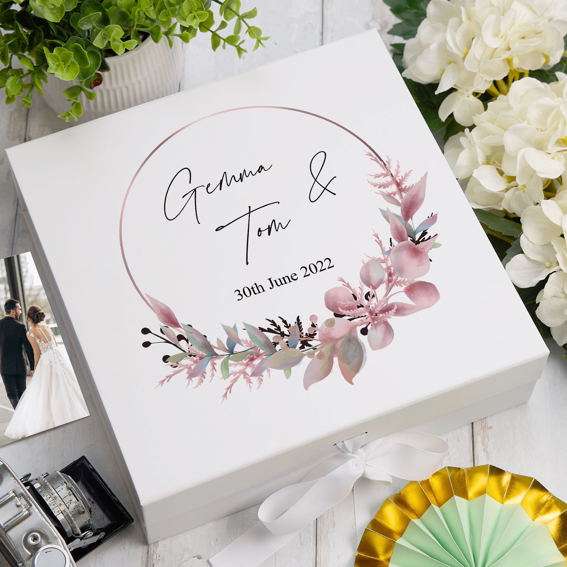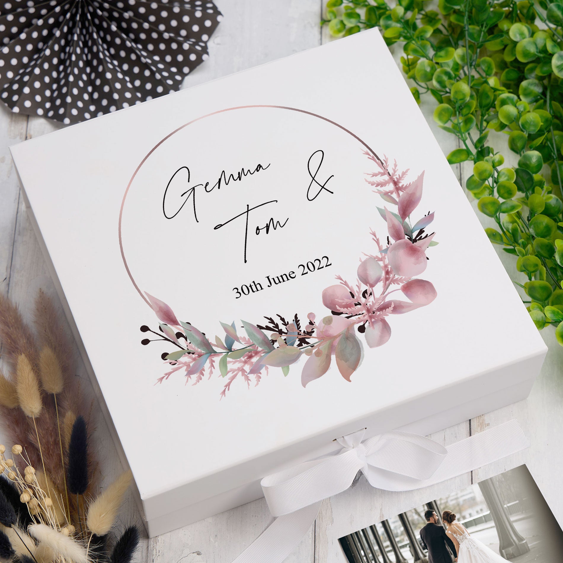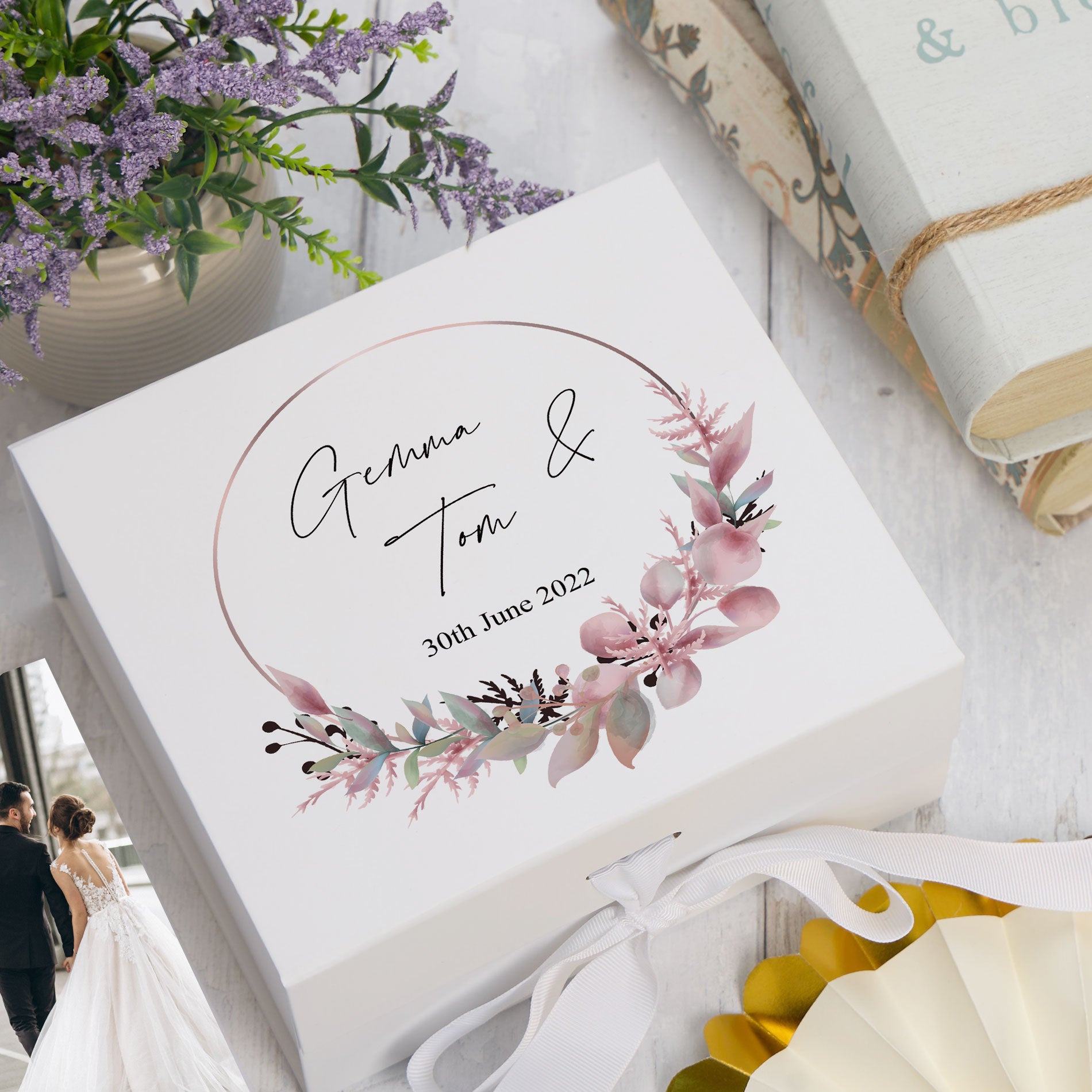 Gorgeous luxury personalised printed rigid card gift box, with lid that has a magnetic closure and is tied with a grosgrain ribbon. The personalised print on this luxury box is raised slightly to create a stunning embossed-style feature. The box itself is sturdy and durable - made from a luxurious 1200gsm white matt laminated rigid board. Available in two sizes and used as a gift box, as a memory box or as part of a hamper. Medium 17cm x 17cm x 8cm Large 30cm x 30cm x 9cm It can be used as a gift box, as a memory box or as part of a hamper. TO PERSONALISE THIS ITEM,