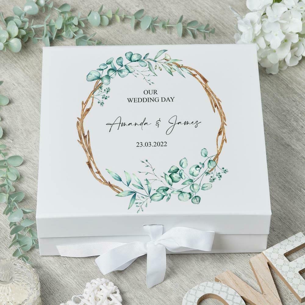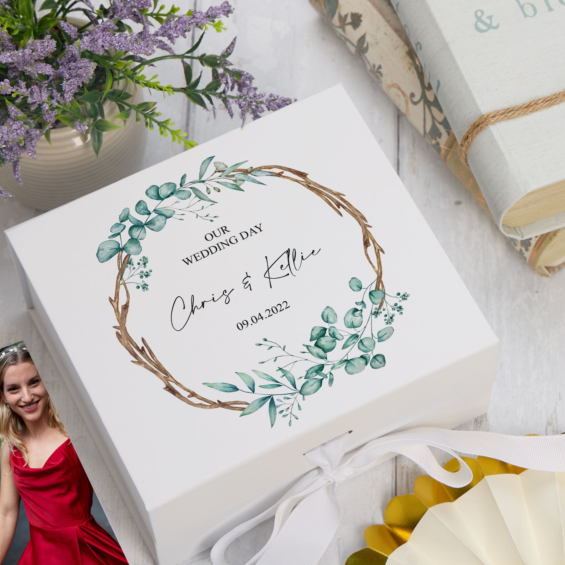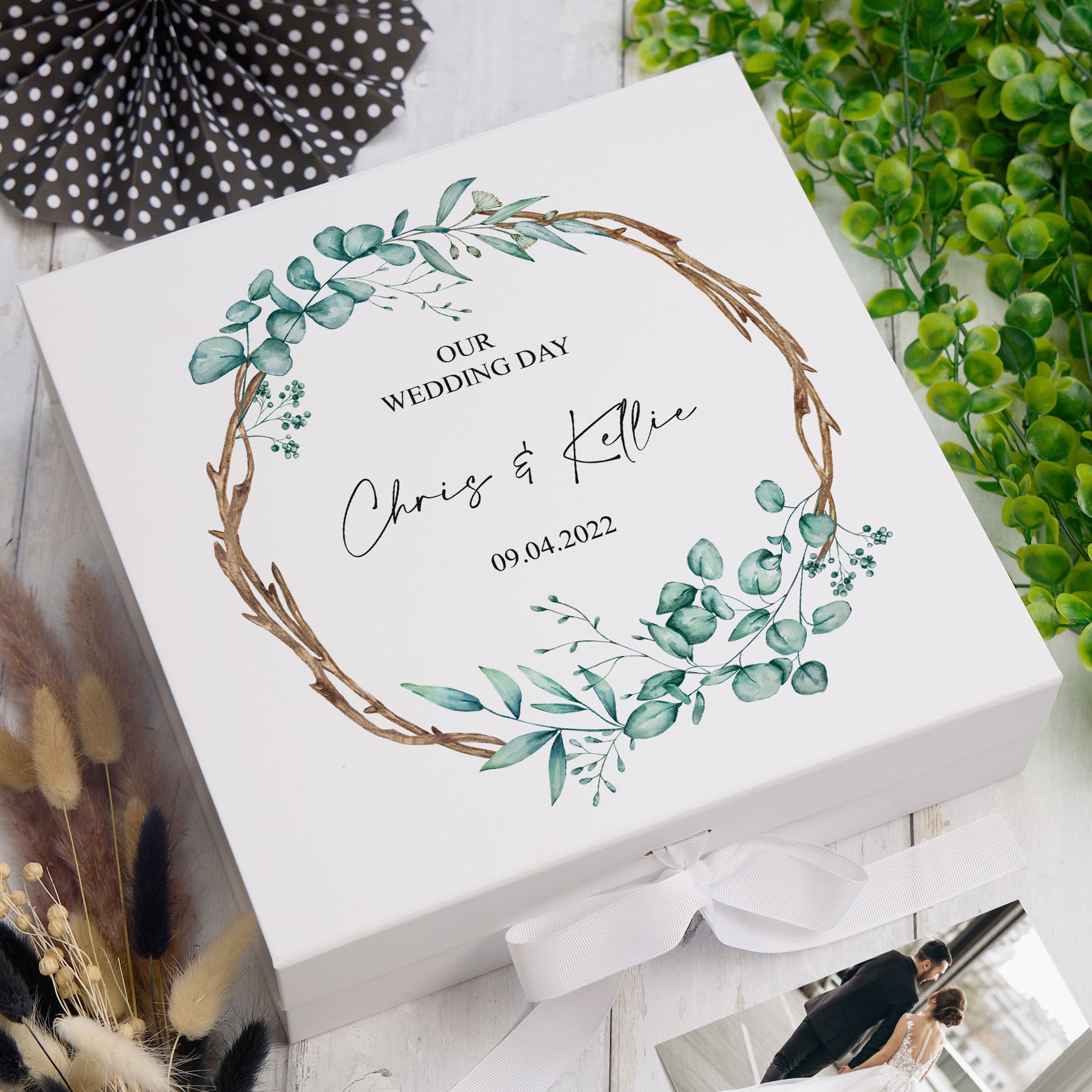 This personalised keepsake box is an elegant way to preserve your wedding memories. Featuring a charming leaves and sticks design, it adds a natural, timeless touch to your special keepsake. Crafted with care, it offers a dedicated space to store mementos such as photos, invitations, and other cherished items from your wedding day. An ideal gift for newlyweds or a thoughtful addition to your own celebration, this memory box combines meaningful personalization with a beautiful design to help you treasure your most memorable moments.