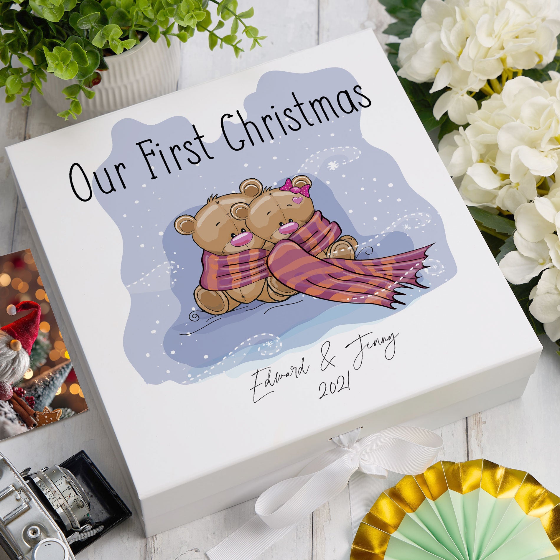Commemorate your first Christmas together with this personalised keepsake box, a meaningful way to preserve the memories and mementos from this milestone celebration. Customised with your names or a special date, this elegant box becomes a tangible record of your shared festive moments. Perfect for storing Christmas cards, photographs from your first holiday together, ticket stubs from seasonal outings, or small decorative keepsakes that mark the occasion. This thoughtfully crafted gift serves as a romantic keepsake for couples, allowing you to revisit cherished memories year after year. An ideal present for newlyweds, newly cohabiting partners, or anyone celebrating a significant first Christmas, it transforms fleeting holiday moments into lasting treasures.