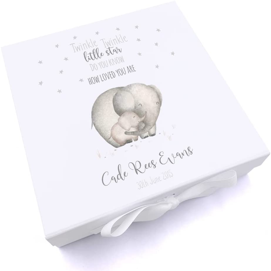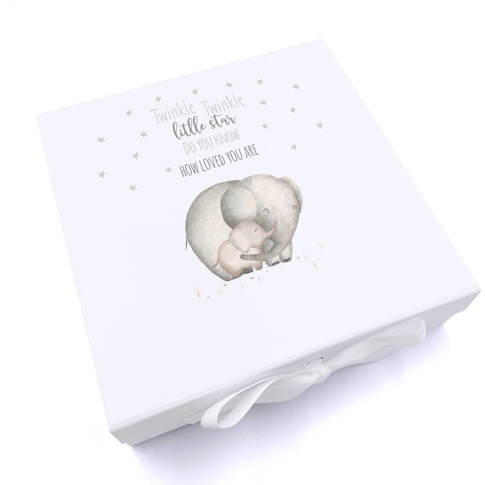 This personalised keepsake memory box features an adorable elephant design inspired by the classic "Twinkle Twinkle Little Star" nursery rhyme. It provides a charming and secure place to store treasured mementos, from first teeth to special momentos, preserving precious memories for years to come. Crafted with care, the box combines sentimental appeal with practical durability, making it an ideal gift for new parents or a meaningful addition to any nursery.
