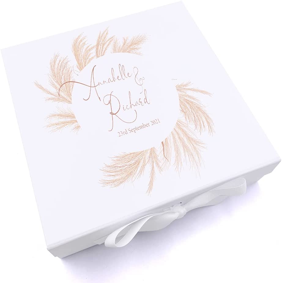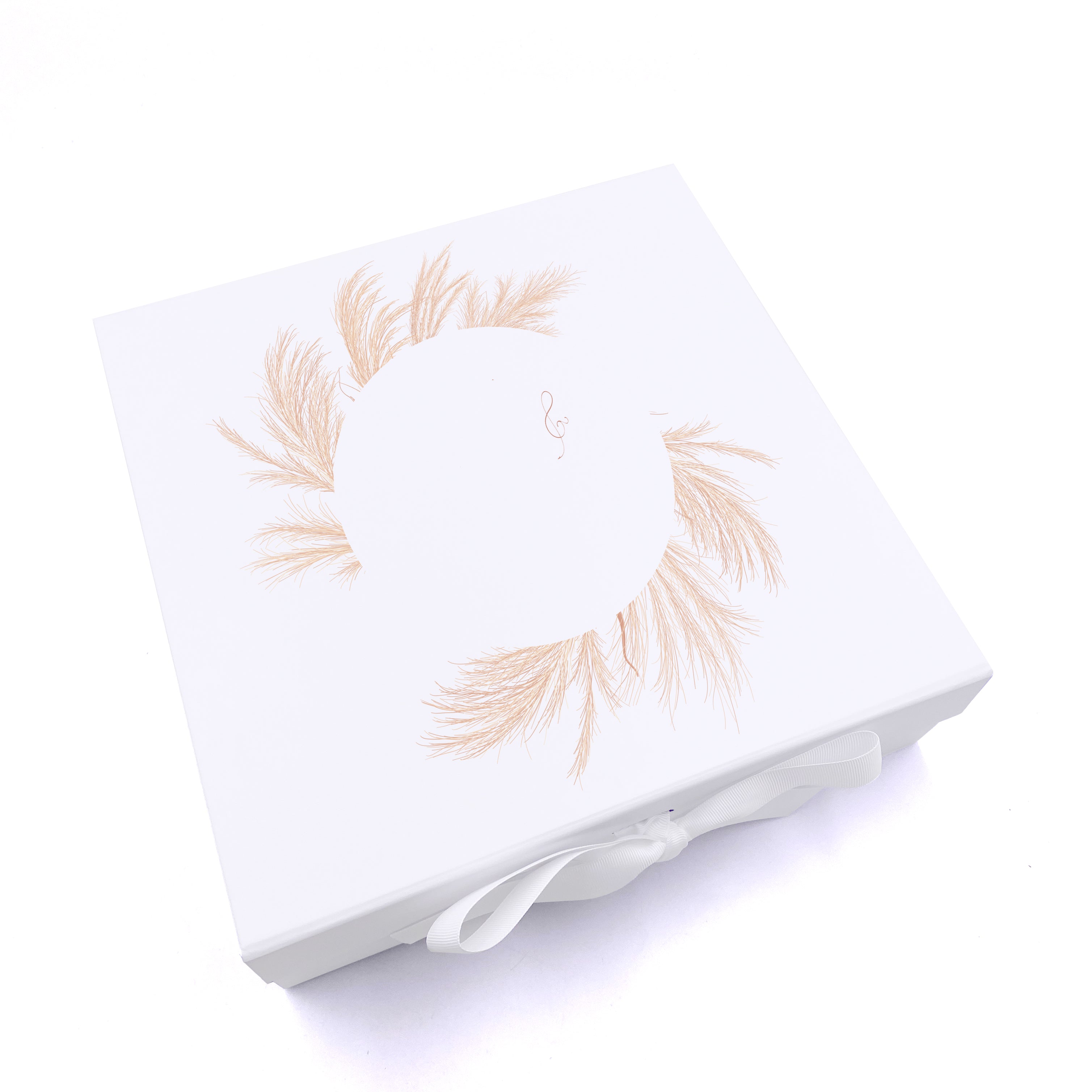 A sophisticated keepsake box designed to preserve your most treasured wedding memories. This elegant piece features an intricate feather motif and can be personalised to make it uniquely yours. Crafted with attention to detail, it serves as both a beautiful display piece and a secure storage solution for sentimental items, photographs, and mementos from your special day. An ideal gift for newlyweds or a meaningful way to honour a cherished milestone.