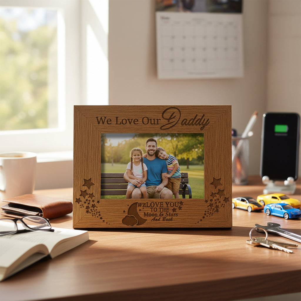 Celebrate the special bond between father and children with this heartfelt wooden photo frame, thoughtfully engraved with sentiments that capture the depth of familial love. The frame features a warm oak wood finish that radiates natural elegance whilst the carefully chosen engravings—"We love our Daddy" across the top and "We love you to the moon and back" beneath—transform it into a deeply personal tribute rather than a generic display piece. The oak wood construction provides both durability and aesthetic warmth, developing character and patina over time as it becomes an increasingly cherished part of the home. This natural material choice ensures the frame complements a wide range of interior styles, from contemporary minimalist spaces to traditionally appointed rooms, whilst maintaining its timeless appeal across decades. The frame accommodates various photo sizes, allowing you to select the dimensions that best suit your preferred image—whether a close-up portrait, a family gathering, or a candid moment that captures the essence of your relationship with Dad. This flexibility ensures the frame adapts to your specific needs and treasured memories. A sturdy rear stand provides stable, level placement on desks, shelves, mantels, nightstands, or any flat surface throughout the home. The frame's prominent positioning ensures the engraved message and photograph remain visible daily, serving as a constant reminder of the unconditional love and connection that defines fatherhood. This is more than functional décor—it's a meaningful keepsake that honours paternal bonds and creates a lasting legacy of affection and gratitude that transcends ordinary gift-giving.