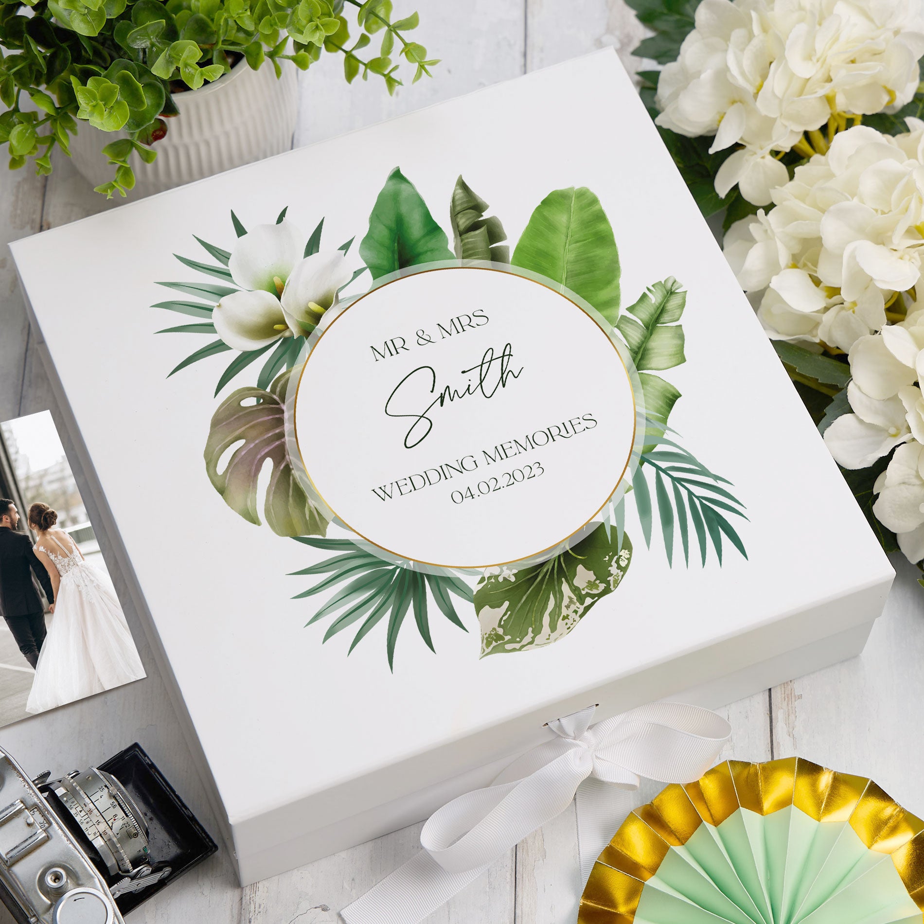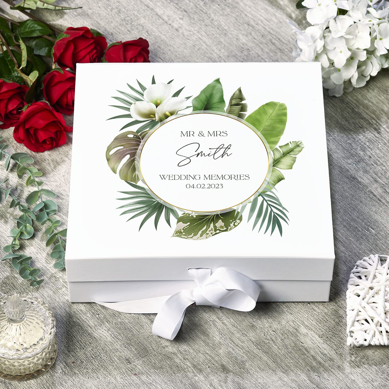 Celebrate the special day with this personalised keepsake memory box featuring a beautiful rainforest theme. Designed to store treasured wedding mementos, it offers a stylish and meaningful way to preserve memories from the ceremony and celebrations. Crafted with attention to detail, this memory box adds a unique, personalised touch that makes it an ideal gift for the bride and groom to cherish for years to come. Its elegant design not only protects precious keepsakes but also serves as a lasting reminder of a memorable day.