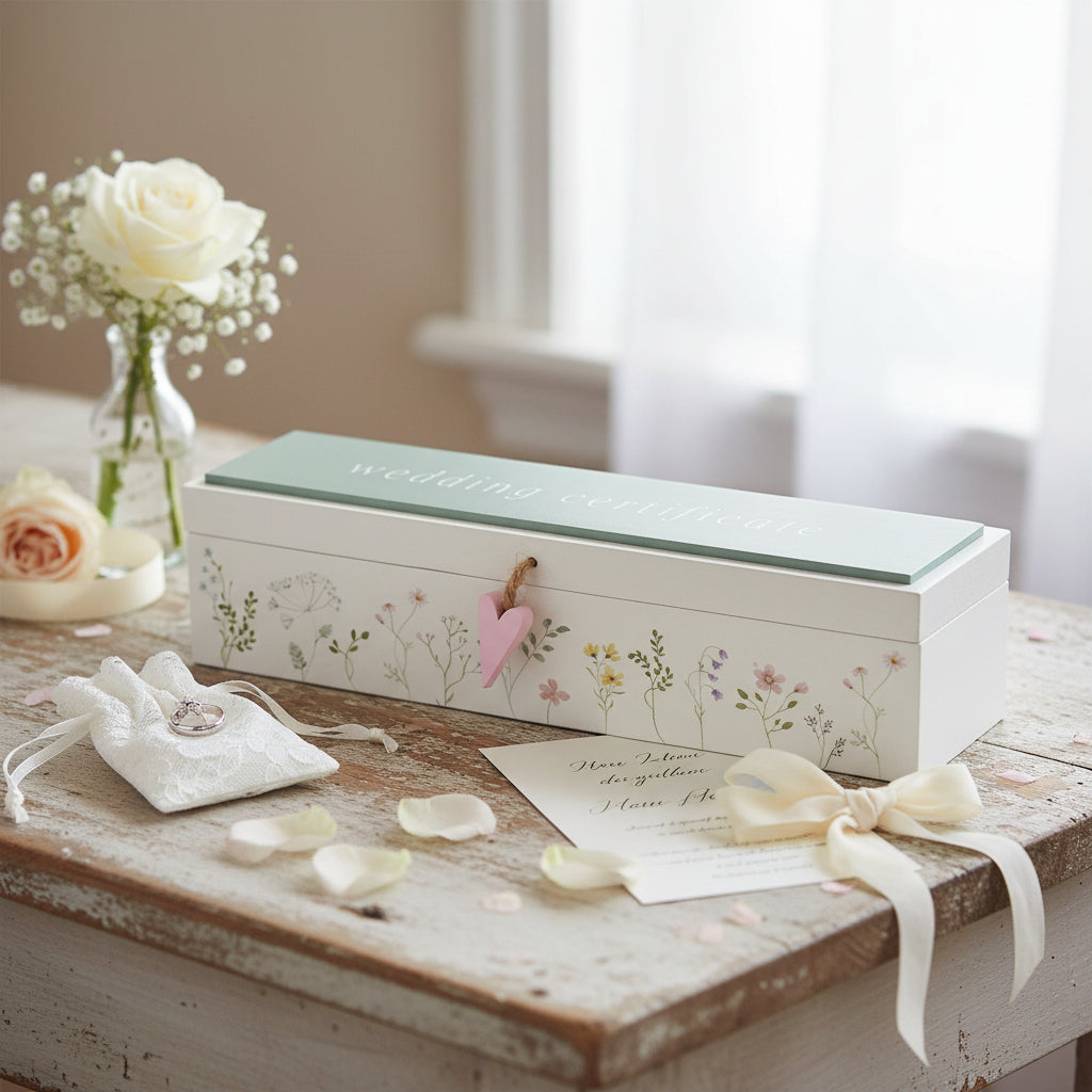 Preserve your most treasured marriage certificate with the Wildflower Certificate Holder, an exquisitely crafted keepsake box that combines elegant design with practical protection. This romantic storage solution features delicate pastel wildflower illustrations hand-painted across its surface, creating a timeless aesthetic that celebrates love and commitment. The top panel displays "Wedding Certificate" in graceful, sophisticated typography, making it instantly recognisable whilst adding to its refined charm.